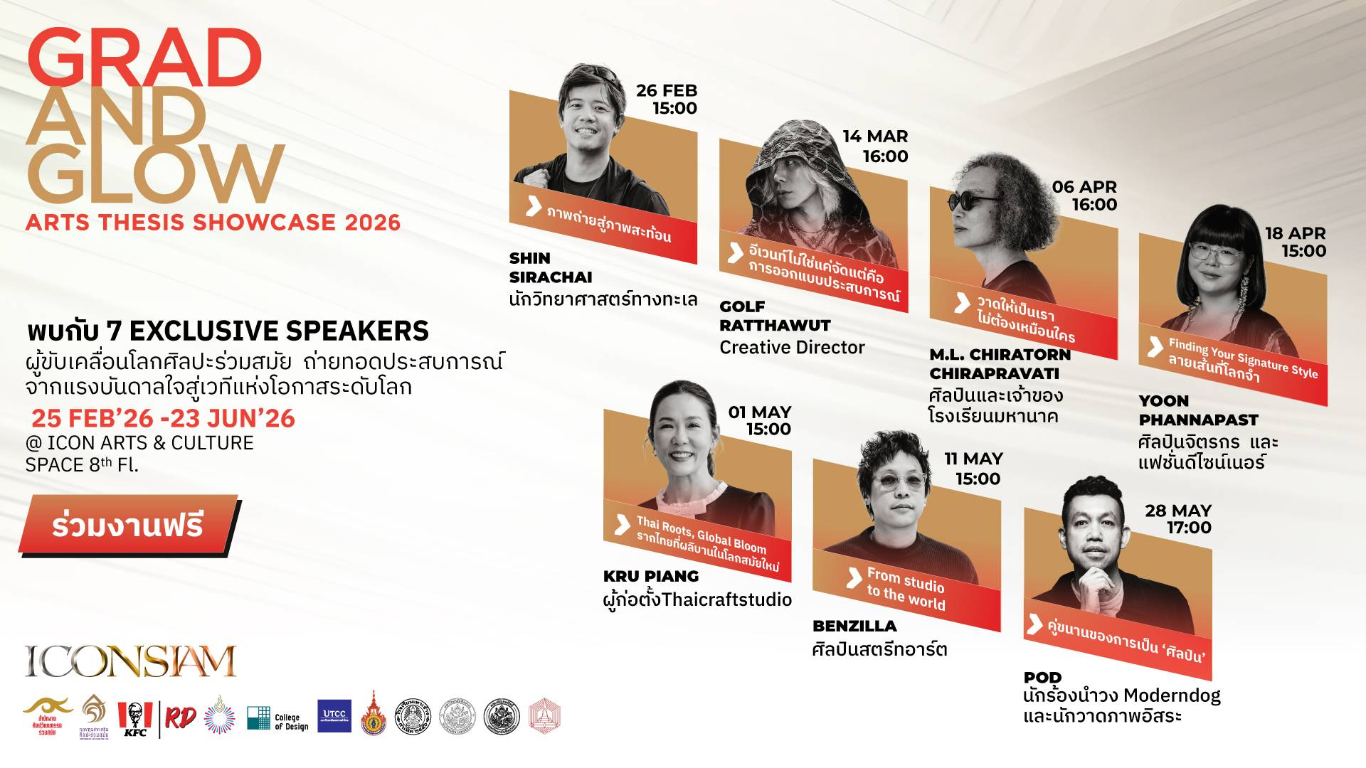 Grad & Glow Arts Thesis Showcase 2026 จัดขึ้นต่อเนื่องเป็นปีที่ 2 เปิดพื้นที่ให้นักศึกษา จาก 7 คณะ 5 มหาวิทยาลัยร่วมจัดแสดงผลงานศิลปนิพนธ์ โดยปีนี้มีมหาวิทยาลัยที่เข้าร่วม ได้แก่ มหาวิทยาลัยรังสิต มหาวิทยาลัยหอการค้าไทย วิทยาลัยเพาะช่าง มหาวิทยาลัยเทคโนโลยีราชมงคลรัตนโกสินทร์ มหาวิทยาลัยศิลปากร และ จุฬาลงกรณ์มหาวิทยาลัย พร้อมกันนี้ ไอคอนสยาม ได้เชิญ 7 Exclusive Speakers ได้แก่ คุณชิน ศิรชัย อรุณรักษ์ติชัย, คุณกอล์ฟ รัฐวุฒิ ชัยวงศ์ขจร, หม่อมหลวงจิราธร จิรประวัติ, คุณยูน ปัณพัท เตชเมธากุล, ครูเพียง ณัฐฐานิตา กาญจนชัยพิวัฒน์, คุณปริญญา ศิริสินสุข (Benzilla) และ POD ธนชัย อุชชิน ผู้ขับเคลื่อนโลกศิลปะร่วมสมัย ซึ่งจะมาร่วมถ่ายทอดประสบการณ์การทำงาน และสร้างแรงบันดาลใจให้กับน้องๆ นักศึกษาในการต่อยอดผลงานสู่เวทีระดับโลกต่อไป
